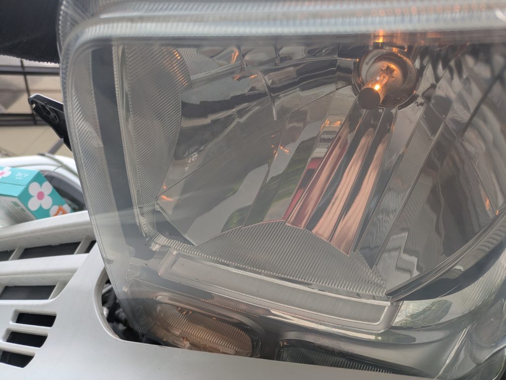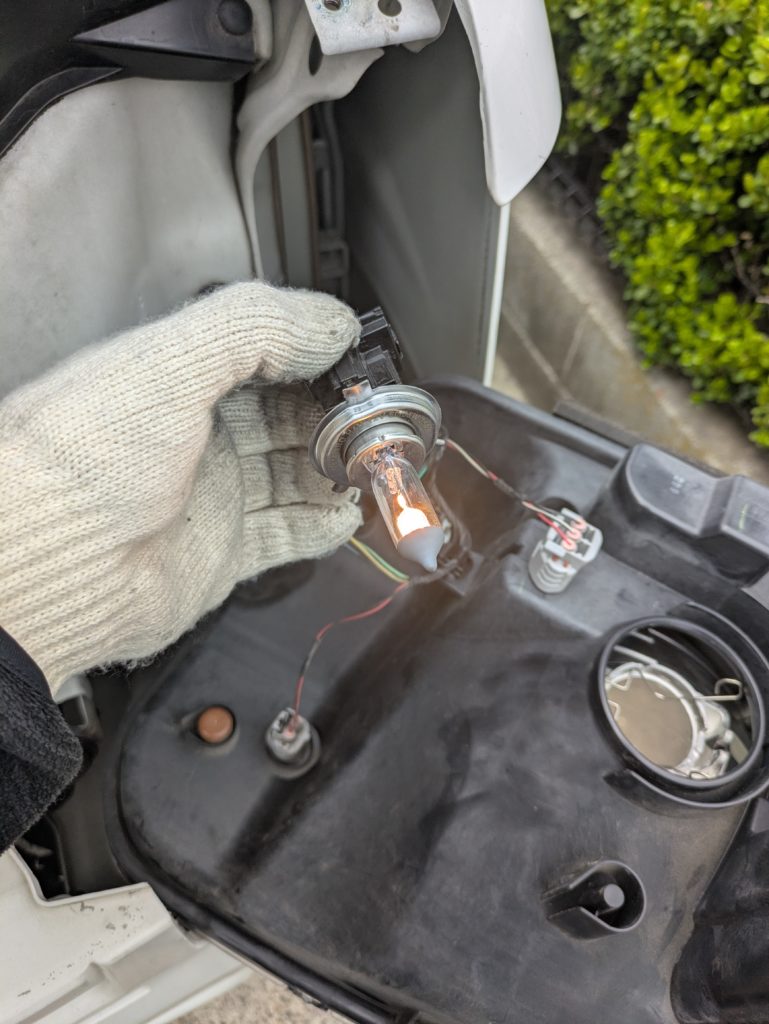 事務所に戻る。工具を持つ。ヘッドライトを外す。バルブを抜き差しする。